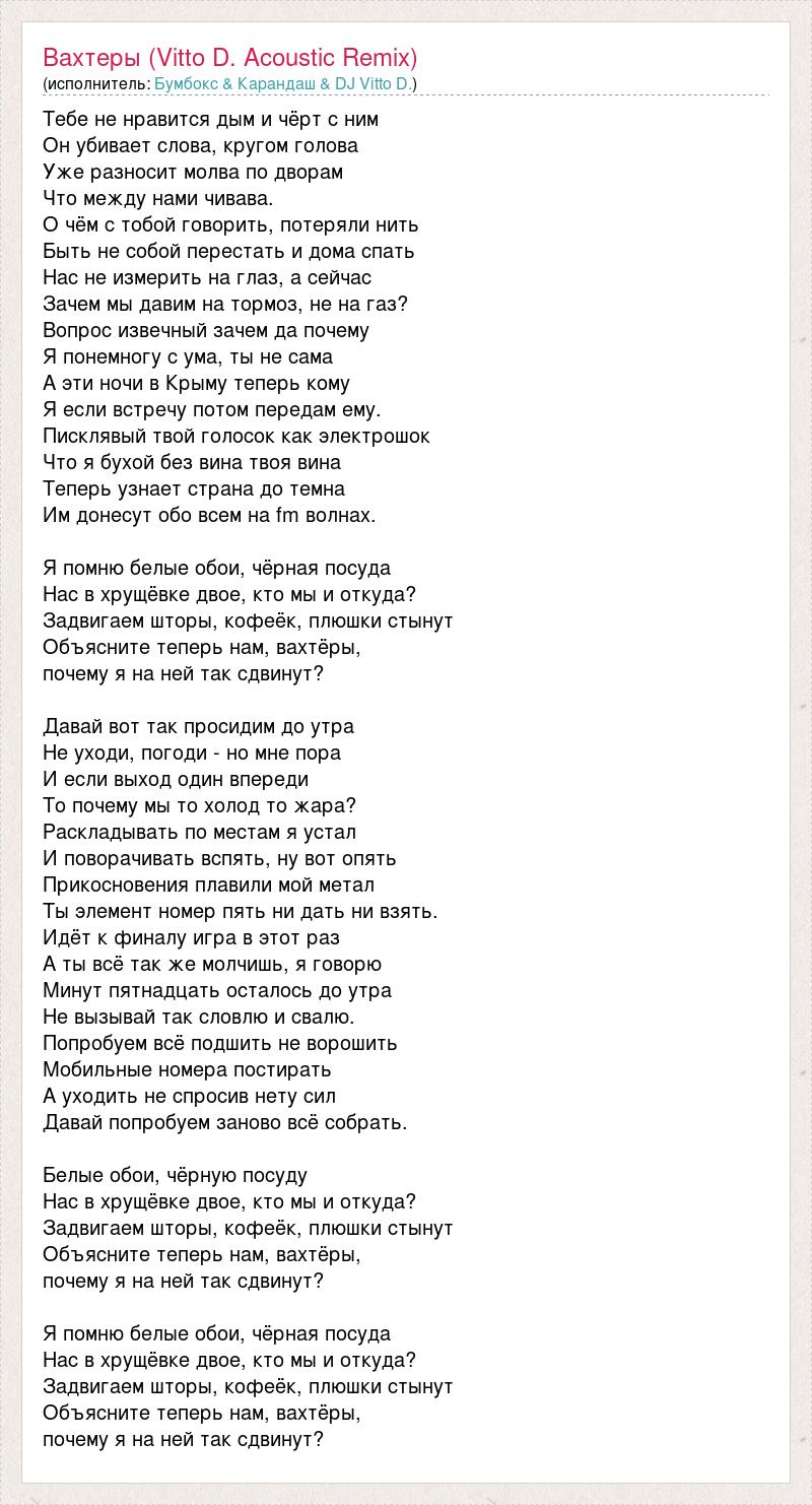 Тебе не нравится дым и чёрт с ним Он убивает слова, кругом голова Уже разносит молва по дворам Что между нами чивава. О чём с тобой говорить, потеряли нить Быть не собой перестать и дома спать Нас не измерить на глаз, а сейчас Зачем мы давим на тормоз, не на газ? Вопрос извечный зачем да почему Я понемногу с ума, ты не сама А эти ночи в Крыму теперь кому Я если встречу потом передам ему. Писклявый твой голосок как электрошок Что я бухой без вина твоя вина Теперь узнает страна до темна Им донесут обо всем на fm волнах. Я помню белые обои, чёрная посуда Нас в хрущёвке двое, кто мы и откуда? Задвигаем шторы, кофеёк, плюшки стынут Объясните теперь нам, вахтёры, почему я на ней так сдвинут? Давай вот так просидим до утра Не уходи, погоди - но мне пора И если выход один впереди То почему мы то холод то жара? Раскладывать по местам я устал И поворачивать вспять, ну вот опять Прикосновения плавили мой метал Ты элемент номер пять ни дать ни взять. Идёт к финалу игра в этот раз А ты всё так же молчишь, я говорю Минут пятнадцать осталось до утра Не вызывай так словлю и свалю. Попробуем всё подшить не ворошить Мобильные номера постирать А уходить не спросив нету сил Давай попробуем заново всё собрать. Белые обои, чёрную посуду Нас в хрущёвке двое, кто мы и откуда? Задвигаем шторы, кофеёк, плюшки стынут Объясните теперь нам, вахтёры, почему я на ней так сдвинут? Я помню белые обои, чёрная посуда Нас в хрущёвке двое, кто мы и откуда? Задвигаем шторы, кофеёк, плюшки стынут Объясните теперь нам, вахтёры, почему я на ней так сдвинут?