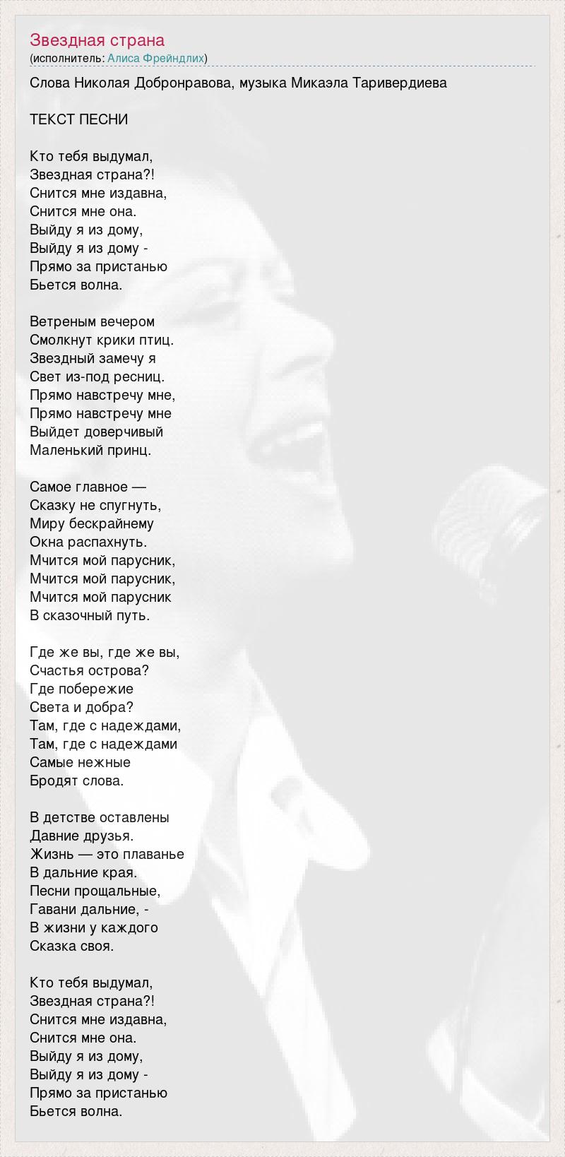 Слова Николая Добронравова, музыка Микаэла Таривердиева ТЕКСТ ПЕСНИ Кто тебя выдумал, Звездная страна?! Снится мне издавна, Снится мне она. Выйду я из дому, Выйду я из дому - Прямо за пристанью Бьется волна. Ветреным вечером Смолкнут крики птиц. Звездный замечу я Свет из-под ресниц. Прямо навстречу мне, Прямо навстречу мне Выйдет доверчивый Маленький принц. Самое главное — Сказку не спугнуть, Миру бескрайнему Окна распахнуть. Мчится мой парусник, Мчится мой парусник, Мчится мой парусник В сказочный путь. Где же вы, где же вы, Счастья острова? Где побережие Света и добра? Там, где с надеждами, Там, где с надеждами Самые нежные Бродят слова. В детстве оставлены Давние друзья. Жизнь — это плаванье В дальние края. Песни прощальные, Гавани дальние, - В жизни у каждого Сказка своя. Кто тебя выдумал, Звездная страна?! Снится мне издавна, Снится мне она. Выйду я из дому, Выйду я из дому - Прямо за пристанью Бьется волна.