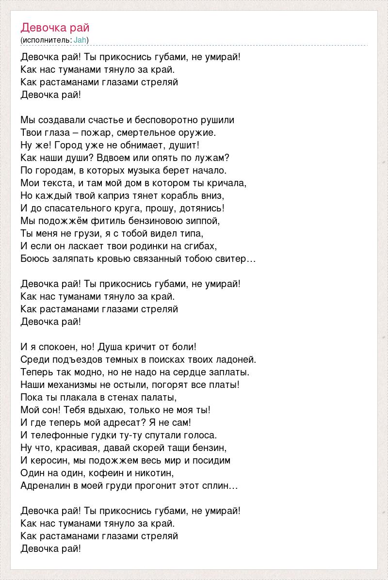 Девочка рай! Ты прикоснись губами, не умирай! Как нас туманами тянуло за край. Как растаманами глазами стреляй Девочка рай! Мы создавали счастье и бесповоротно рушили Твои глаза – пожар, смертельное оружие. Ну же! Город уже не обнимает, душит! Как наши души? Вдвоем или опять по лужам? По городам, в которых музыка берет начало. Мои текста, и там мой дом в котором ты кричала, Но каждый твой каприз тянет корабль вниз, И до спасательного круга, прошу, дотянись! Мы подожжём фитиль бензиновою зиппой, Ты меня не грузи, я с тобой видел типа, И если он ласкает твои родинки на сгибах, Боюсь заляпать кровью связанный тобою свитер… Девочка рай! Ты прикоснись губами, не умирай! Как нас туманами тянуло за край. Как растаманами глазами стреляй Девочка рай! И я спокоен, но! Душа кричит от боли! Среди подъездов темных в поисках твоих ладоней. Теперь так модно, но не надо на сердце заплаты. Наши механизмы не остыли, погорят все платы! Пока ты плакала в стенах палаты, Мой сон! Тебя вдыхаю, только не моя ты! И где теперь мой адресат? Я не сам! И телефонные гудки ту-ту спутали голоса. Ну что, красивая, давай скорей тащи бензин, И керосин, мы подожжем весь мир и посидим Один на один, кофеин и никотин, Адреналин в моей груди прогонит этот сплин… Девочка рай! Ты прикоснись губами, не умирай! Как нас туманами тянуло за край. Как растаманами глазами стреляй Девочка рай!
