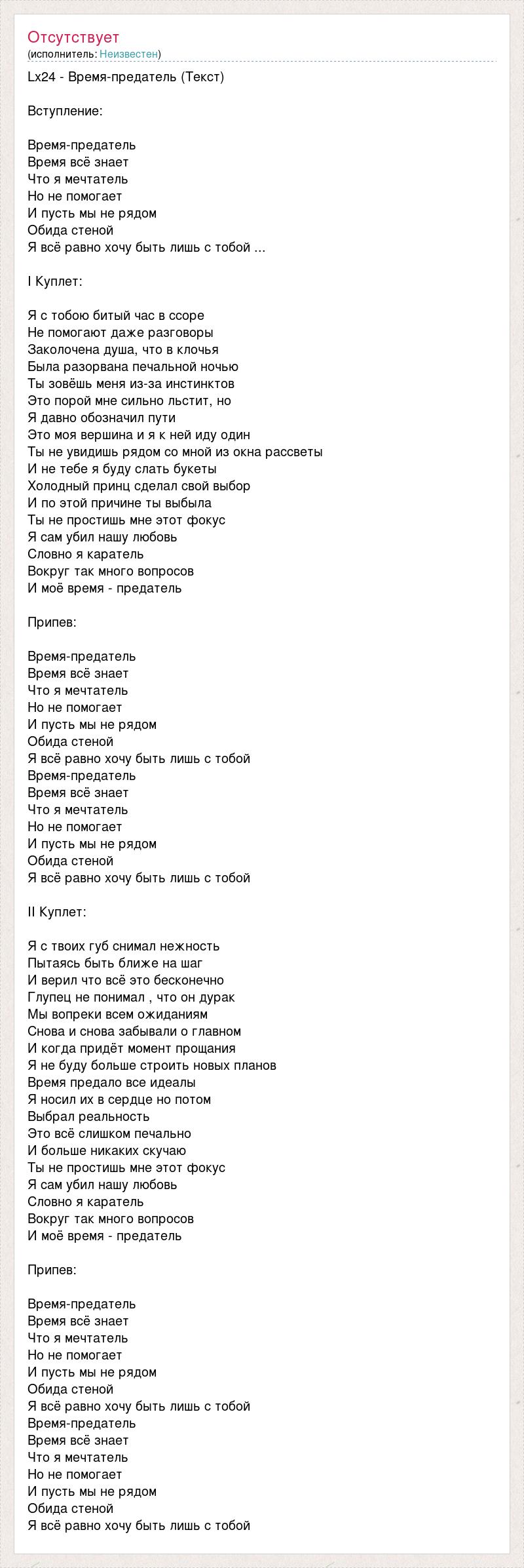 Lx24 - Время-предатель (Текст) Вступление: Время-предатель Время всё знает Что я мечтатель Но не помогает И пусть мы не рядом Обида стеной Я всё равно хочу быть лишь с тобой ... I Куплет: Я с тобою битый час в ссоре Не помогают даже разговоры Заколочена душа, что в клочья Была разорвана печальной ночью Ты зовёшь меня из-за инстинктов Это порой мне сильно льстит, но Я давно обозначил пути Это моя вершина и я к ней иду один Ты не увидишь рядом со мной из окна рассветы И не тебе я буду слать букеты Холодный принц сделал свой выбор И по этой причине ты выбыла Ты не простишь мне этот фокус Я сам убил нашу любовь Словно я каратель Вокруг так много вопросов И моё время - предатель Припев: Время-предатель Время всё знает Что я мечтатель Но не помогает И пусть мы не рядом Обида стеной Я всё равно хочу быть лишь с тобой Время-предатель Время всё знает Что я мечтатель Но не помогает И пусть мы не рядом Обида стеной Я всё равно хочу быть лишь с тобой II Куплет: Я с твоих губ снимал нежность Пытаясь быть ближе на шаг И верил что всё это бесконечно Глупец не понимал , что он дурак Мы вопреки всем ожиданиям Снова и снова забывали о главном И когда придёт момент прощания Я не буду больше строить новых планов Время предало все идеалы Я носил их в сердце но потом Выбрал реальность Это всё слишком печально И больше никаких скучаю Ты не простишь мне этот фокус Я сам убил нашу любовь Словно я каратель Вокруг так много вопросов И моё время - предатель Припев: Время-предатель Время всё знает Что я мечтатель Но не помогает И пусть мы не рядом Обида стеной Я всё равно хочу быть лишь с тобой Время-предатель Время всё знает Что я мечтатель Но не помогает И пусть мы не рядом Обида стеной Я всё равно хочу быть лишь с тобой