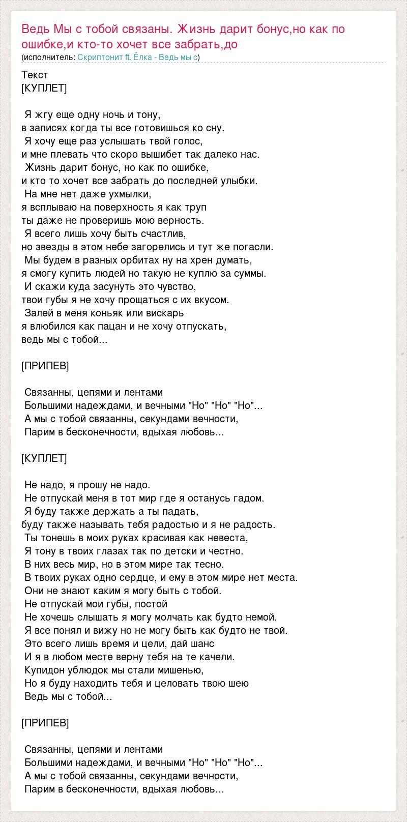 Текст [КУПЛЕТ] Я жгу еще одну ночь и тону, в записях когда ты все готовишься ко сну. Я хочу еще раз услышать твой голос, и мне плевать что скоро вышибет так далеко нас. Жизнь дарит бонус, но как по ошибке, и кто то хочет все забрать до последней улыбки. На мне нет даже ухмылки, я всплываю на поверхность я как труп ты даже не проверишь мою верность. Я всего лишь хочу быть счастлив, но звезды в этом небе загорелись и тут же погасли. Мы будем в разных орбитах ну на хрен думать, я смогу купить людей но такую не куплю за суммы. И скажи куда засунуть это чувство, твои губы я не хочу прощаться с их вкусом. Залей в меня коньяк или вискарь я влюбился как пацан и не хочу отпускать, ведь мы с тобой... [ПРИПЕВ] Связанны, цепями и лентами Большими надеждами, и вечными "Но" "Но" "Но"... А мы с тобой связанны, секундами вечности, Парим в бесконечности, вдыхая любовь... [КУПЛЕТ] Не надо, я прошу не надо. Не отпускай меня в тот мир где я останусь гадом. Я буду также держать а ты падать, буду также называть тебя радостью и я не радость. Ты тонешь в моих руках красивая как невеста, Я тону в твоих глазах так по детски и честно. В них весь мир, но в этом мире так тесно. В твоих руках одно сердце, и ему в этом мире нет места. Они не знают каким я могу быть с тобой. Не отпускай мои губы, постой Не хочешь слышать я могу молчать как будто немой. Я все понял и вижу но не могу быть как будто не твой. Это всего лишь время и цели, дай шанс И я в любом месте верну тебя на те качели. Купидон ублюдок мы стали мишенью, Но я буду находить тебя и целовать твою шею Ведь мы с тобой... [ПРИПЕВ] Связанны, цепями и лентами Большими надеждами, и вечными "Но" "Но" "Но"... А мы с тобой связанны, секундами вечности, Парим в бесконечности, вдыхая любовь...