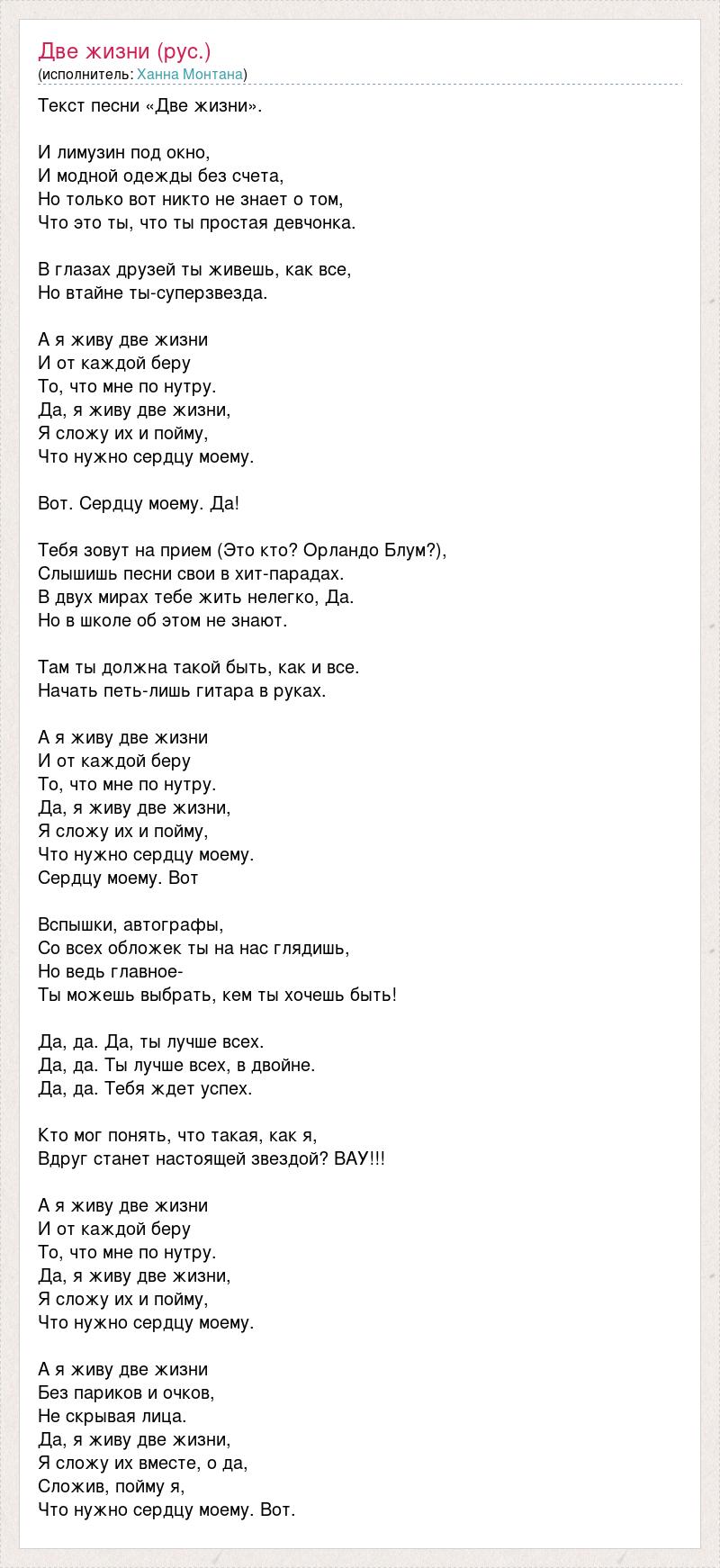 Текст песни «Две жизни». И лимузин под окно, И модной одежды без счета, Но только вот никто не знает о том, Что это ты, что ты простая девчонка. В глазах друзей ты живешь, как все, Но втайне ты-суперзвезда. А я живу две жизни И от каждой беру То, что мне по нутру. Да, я живу две жизни, Я сложу их и пойму, Что нужно сердцу моему. Вот. Сердцу моему. Да! Тебя зовут на прием (Это кто? Орландо Блум?), Слышишь песни свои в хит-парадах. В двух мирах тебе жить нелегко, Да. Но в школе об этом не знают. Там ты должна такой быть, как и все. Начать петь-лишь гитара в руках. А я живу две жизни И от каждой беру То, что мне по нутру. Да, я живу две жизни, Я сложу их и пойму, Что нужно сердцу моему. Сердцу моему. Вот Вспышки, автографы, Со всех обложек ты на нас глядишь, Но ведь главное- Ты можешь выбрать, кем ты хочешь быть! Да, да. Да, ты лучше всех. Да, да. Ты лучше всех, в двойне. Да, да. Тебя ждет успех. Кто мог понять, что такая, как я, Вдруг станет настоящей звездой? ВАУ!!! А я живу две жизни И от каждой беру То, что мне по нутру. Да, я живу две жизни, Я сложу их и пойму, Что нужно сердцу моему. А я живу две жизни Без париков и очков, Не скрывая лица. Да, я живу две жизни, Я сложу их вместе, о да, Сложив, пойму я, Что нужно сердцу моему. Вот.