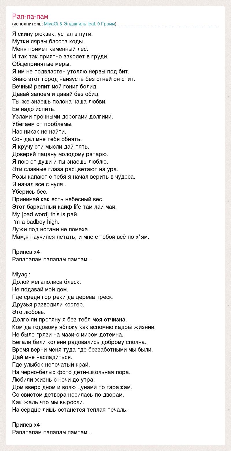 Я скину рюкзак, устал в пути. Мутки лярвы басота коды. Меня примет каменный лес. И так так приятно заколет в груди. Общепринятые меры. Я им не подвластен утоляю нервы под бит. Знаю этот город наизусть без огней он спит. Вечный репит мой гонит болид. Давай запоем и давай без обид. Ты же знаешь полона чаша любви. Её надо испить. Узлами прочными дорогами долгими. Убегаем от проблемы. Нас никак не найти. Сон дал мне тебя обнять. Я кручу эти мысли дай пять. Доверяй пацану молодому рэпарю. Я пою от души и ты знаешь люблю. Эти славные глаза расцветают на ура. Розы капают с тебя я начал верить в чудеса. Я начал все с нуля . Уберись бес. Принимай как есть небесный вес. Этот бархатный кайф life там лай май. My [bad word] this is рай. I'm a badboy high. Лужи под ногами не помеха. Мам,я научился летать, и мне с тобой всё по х*ям. Припев x4 Рапапапам папапам пампам... Miyagi: Долой мегаполиса блеск. Не подавай мой дом. Где среди гор реки да дерева треск. Друзья разводили костер. Это любовь. Долго ли протяну я без тебя моя отчизна. Ком да годовому яблоку как вспомню кадры жизнии. Не было грязи на мази-с миром дотемна. Бегали били колени радовались доброму сполна. Время верни меня туда где беззаботными мы были. Дай мне насладиться. Где улыбок непочатый край. На черно-белых фото дети-школьная пора. Любили жизнь с ночи до утра. Дом вверх дном и волю цунами по гаражам. Со свистом детвора носилась по дворам. Как жаль,что мы выросли. На сердце лишь останется теплая печаль. Припев x4 Рапапапам папапам пампам...
