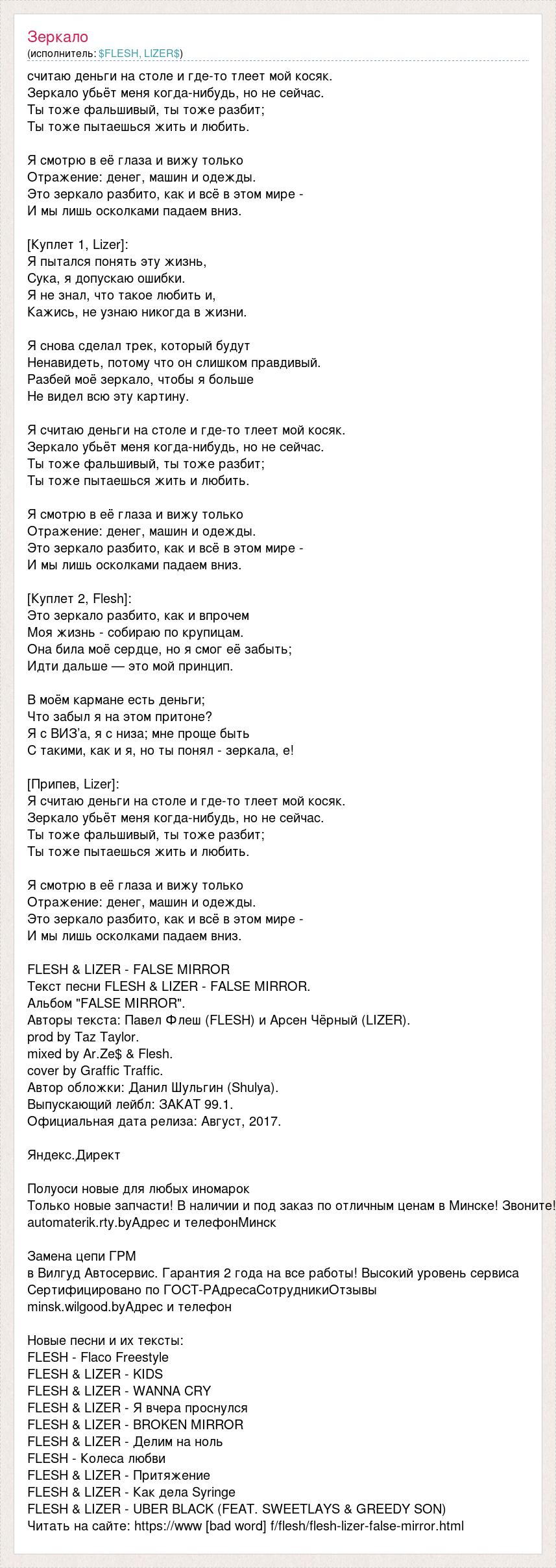 считаю деньги на столе и где-то тлеет мой косяк. Зеркало убьёт меня когда-нибудь, но не сейчас. Ты тоже фальшивый, ты тоже разбит; Ты тоже пытаешься жить и любить. Я смотрю в её глаза и вижу только Отражение: денег, машин и одежды. Это зеркало разбито, как и всё в этом мире - И мы лишь осколками падаем вниз. [Куплет 1, Lizer]: Я пытался понять эту жизнь, Сука, я допускаю ошибки. Я не знал, что такое любить и, Кажись, не узнаю никогда в жизни. Я снова сделал трек, который будут Ненавидеть, потому что он слишком правдивый. Разбей моё зеркало, чтобы я больше Не видел всю эту картину. Я считаю деньги на столе и где-то тлеет мой косяк. Зеркало убьёт меня когда-нибудь, но не сейчас. Ты тоже фальшивый, ты тоже разбит; Ты тоже пытаешься жить и любить. Я смотрю в её глаза и вижу только Отражение: денег, машин и одежды. Это зеркало разбито, как и всё в этом мире - И мы лишь осколками падаем вниз. [Куплет 2, Flesh]: Это зеркало разбито, как и впрочем Моя жизнь - собираю по крупицам. Она била моё сердце, но я смог её забыть; Идти дальше — это мой принцип. В моём кармане есть деньги; Что забыл я на этом притоне? Я с ВИЗ’а, я с низа; мне проще быть С такими, как и я, но ты понял - зеркала, e! [Припев, Lizer]: Я считаю деньги на столе и где-то тлеет мой косяк. Зеркало убьёт меня когда-нибудь, но не сейчас. Ты тоже фальшивый, ты тоже разбит; Ты тоже пытаешься жить и любить. Я смотрю в её глаза и вижу только Отражение: денег, машин и одежды. Это зеркало разбито, как и всё в этом мире - И мы лишь осколками падаем вниз. FLESH & LIZER - FALSE MIRROR Текст песни FLESH & LIZER - FALSE MIRROR. Альбом "FALSE MIRROR". Авторы текста: Павел Флеш (FLESH) и Арсен Чёрный (LIZER). prod by Taz Taylor. mixed by Ar.Ze$ & Flesh. cover by Graffic Traffic. Автор обложки: Данил Шульгин (Shulya). Выпускающий лейбл: ЗАКАТ 99.1. Официальная дата релиза: Август, 2017. Яндекс.Директ Полуоси новые для любых иномарок Только новые запчасти! В наличии и под заказ по отличным ценам в Минске! Звоните! automaterik.rty.byАдрес и телефонМинск Замена цепи ГРМ в Вилгуд Автосервис. Гарантия 2 года на все работы! Высокий уровень сервиса Сертифицировано по ГОСТ-РАдресаСотрудникиОтзывы minsk.wilgood.byАдрес и телефон Новые песни и их тексты: FLESH - Flaco Freestyle FLESH & LIZER - KIDS FLESH & LIZER - WANNA CRY FLESH & LIZER - Я вчера проснулся FLESH & LIZER - BROKEN MIRROR FLESH & LIZER - Делим на ноль FLESH - Колеса любви FLESH & LIZER - Притяжение FLESH & LIZER - Как дела Syringe FLESH & LIZER - UBER BLACK (FEAT. SWEETLAYS & GREEDY SON) Читать на сайте: https://www [bad word] f/flesh/flesh-lizer-false-mirror.html