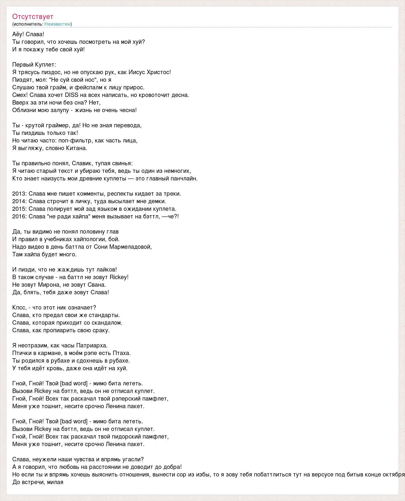 Аёу! Слава! Ты говорил, что хочешь посмотреть на мой хуй? И я покажу тебе свой хуй! Первый Куплет: Я трясусь пиздос, но не опускаю рук, как Иисус Христос! Пиздят, мол: "Не суй свой нос", но я Слушаю твой грайм, и фейспалм к лицу прирос. Смех! Слава хочет DISS на всех написать, но кровоточит десна. Вверх за эти ночи без сна? Нет, Облизни мою залупу - жизнь не очень чесна! Ты - крутой граймер, да! Но не зная перевода, Ты пиздишь только так! Но читаю часто: поп-фильтр, как часть лица, Я выгляжу, словно Китана. Ты правильно понял, Славик, тупая свинья: Я читаю старый текст и убираю тебя, ведь ты один из немногих, Кто знает наизусть мои древние куплеты — это главный панчлайн. 2013: Слава мне пишет комменты, респекты кидает за треки. 2014: Слава строчит в личку, туда высылает мне демки. 2015: Слава полирует мой зад языком в ожидании куплета. 2016: Слава "не ради хайпа" меня вызывает на бэттл, —че?! Да, ты видимо не понял половину глав И правил в учебниках хайпологии, бой. Надо видео в день баттла от Сони Мармеладовой, Там хайпа будет много. И пизди, что не жаждишь тут лайков! В таком случае - на баттл не зовут Rickey! Не зовут Мирона, не зовут Свана. Да, блять, тебя даже зовут Слава! Кпсс, - что этот ник означает? Слава, кто предал свои же стандарты. Слава, которая приходит со скандалом. Слава, как пропиарить свою сраку. Я неотразим, как часы Патриарха. Птички в кармане, в моём рэпе есть Птаха. Ты родился в рубахе и сдохнешь в рубахе. У тебя идёт кровь, даже она идёт на xуй. Гной, Гной! Твой [bad word] - мимо бита лететь. Вызови Rickey на бэттл, ведь он не отписал куплет. Гной, Гной! Всех так раскачал твой рэперский памфлет, Меня уже тошнит, несите срочно Ленина пакет. Гной, Гной! Твой [bad word] - мимо бита лететь. Вызови Rickey на бэттл, ведь он не отписал куплет. Гной, Гной! Всех так раскачал твой пидорский памфлет, Меня уже тошнит, несите срочно Ленина пакет. Слава, неужели наши чувства и впрямь угасли? А я говорил, что любовь на расстоянии не доводит до добра! Но если ты и впрямь хочешь выяснить отношения, вынести сор из избы, то я зову тебя побаттлиться тут на версусе под битыв конце октября До встречи, милая