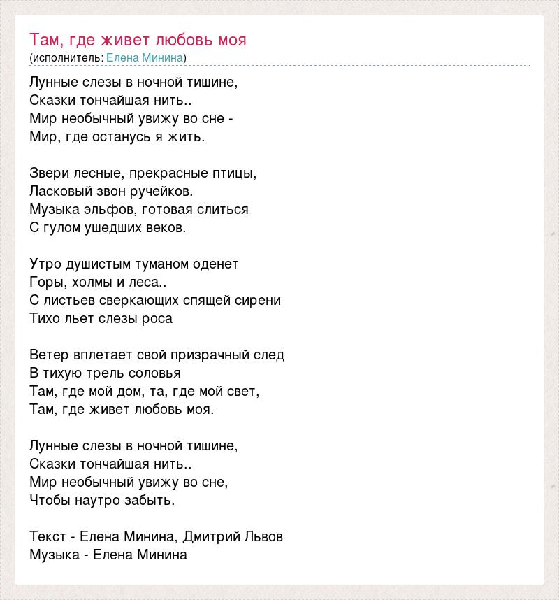 Лунные слезы в ночной тишине, Сказки тончайшая нить.. Мир необычный увижу во сне - Мир, где останусь я жить. Звери лесные, прекрасные птицы, Ласковый звон ручейков. Музыка эльфов, готовая слиться С гулом ушедших веков. Утро душистым туманом оденет Горы, холмы и леса.. С листьев сверкающих спящей сирени Тихо льет слезы роса Ветер вплетает свой призрачный след В тихую трель соловья Там, где мой дом, та, где мой свет, Там, где живет любовь моя. Лунные слезы в ночной тишине, Сказки тончайшая нить.. Мир необычный увижу во сне, Чтобы наутро забыть. Текст - Елена Минина, Дмитрий Львов Музыка - Елена Минина