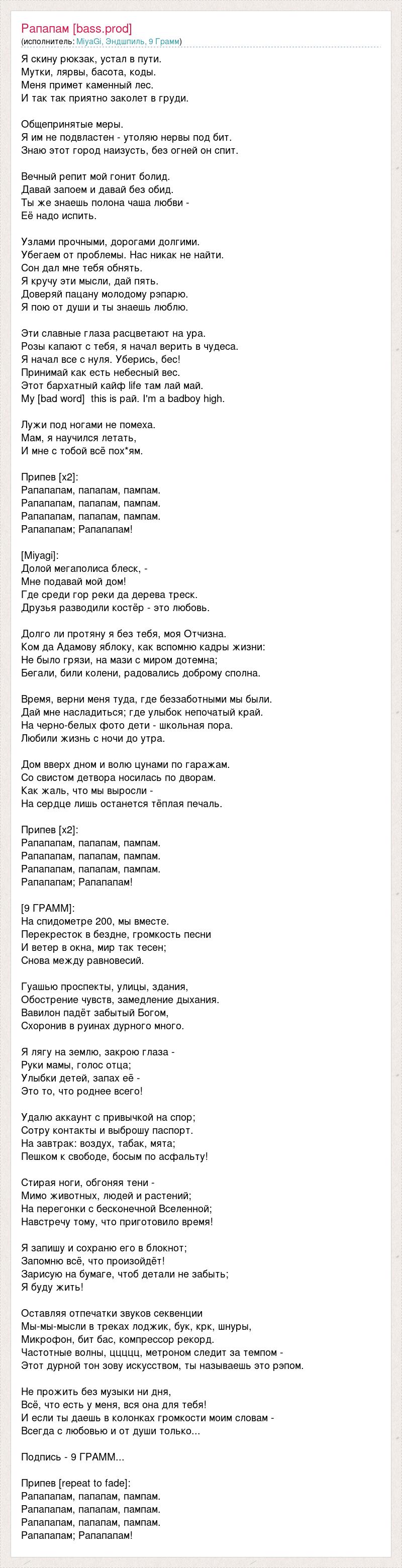 Я скину рюкзак, устал в пути. Мутки, лярвы, басота, коды. Меня примет каменный лес. И так так приятно заколет в груди. Общепринятые меры. Я им не подвластен - утоляю нервы под бит. Знаю этот город наизусть, без огней он спит. Вечный репит мой гонит болид. Давай запоем и давай без обид. Ты же знаешь полона чаша любви - Её надо испить. Узлами прочными, дорогами долгими. Убегаем от проблемы. Нас никак не найти. Сон дал мне тебя обнять. Я кручу эти мысли, дай пять. Доверяй пацану молодому рэпарю. Я пою от души и ты знаешь люблю. Эти славные глаза расцветают на ура. Розы капают с тебя, я начал верить в чудеса. Я начал все с нуля. Уберись, бес! Принимай как есть небесный вес. Этот бархатный кайф life там лай май. My [bad word] this is рай. I'm a badboy high. Лужи под ногами не помеха. Мам, я научился летать, И мне с тобой всё пох*ям. Припев [x2]: Рапапапам, папапам, пампам. Рапапапам, папапам, пампам. Рапапапам, папапам, пампам. Рапапапам; Рапапапам! [Miyagi]: Долой мегаполиса блеск, - Мне подавай мой дом! Где среди гор реки да дерева треск. Друзья разводили костёр - это любовь. Долго ли протяну я без тебя, моя Отчизна. Ком да Адамову яблоку, как вспомню кадры жизни: Не было грязи, на мази с миром дотемна; Бегали, били колени, радовались доброму сполна. Время, верни меня туда, где беззаботными мы были. Дай мне насладиться; где улыбок непочатый край. На черно-белых фото дети - школьная пора. Любили жизнь с ночи до утра. Дом вверх дном и волю цунами по гаражам. Со свистом детвора носилась по дворам. Как жаль, что мы выросли - На сердце лишь останется тёплая печаль. Припев [x2]: Рапапапам, папапам, пампам. Рапапапам, папапам, пампам. Рапапапам, папапам, пампам. Рапапапам; Рапапапам! [9 ГРАММ]: На спидометре 200, мы вместе. Перекресток в бездне, громкость песни И ветер в окна, мир так тесен; Снова между равновесий. Гуашью проспекты, улицы, здания, Обострение чувств, замедление дыхания. Вавилон падёт забытый Богом, Схоронив в руинах дурного много. Я лягу на землю, закрою глаза - Руки мамы, голос отца; Улыбки детей, запах её - Это то, что роднее всего! Удалю аккаунт с привычкой на спор; Сотру контакты и выброшу паспорт. На завтрак: воздух, табак, мята; Пешком к свободе, босым по асфальту! Стирая ноги, обгоняя тени - Мимо животных, людей и растений; На перегонки с бесконечной Вселенной; Навстречу тому, что приготовило время! Я запишу и сохраню его в блокнот; Запомню всё, что произойдёт! Зарисую на бумаге, чтоб детали не забыть; Я буду жить! Оставляя отпечатки звуков секвенции Мы-мы-мысли в треках лоджик, бук, крк, шнуры, Микрофон, бит бас, компрессор рекорд. Частотные волны, ццццц, метроном следит за темпом - Этот дурной тон зову искусством, ты называешь это рэпом. Не прожить без музыки ни дня, Всё, что есть у меня, вся она для тебя! И если ты даешь в колонках громкости моим словам - Всегда с любовью и от души только... Подпись - 9 ГРАММ... Припев [repeat to fade]: Рапапапам, папапам, пампам. Рапапапам, папапам, пампам. Рапапапам, папапам, пампам. Рапапапам; Рапапапам!