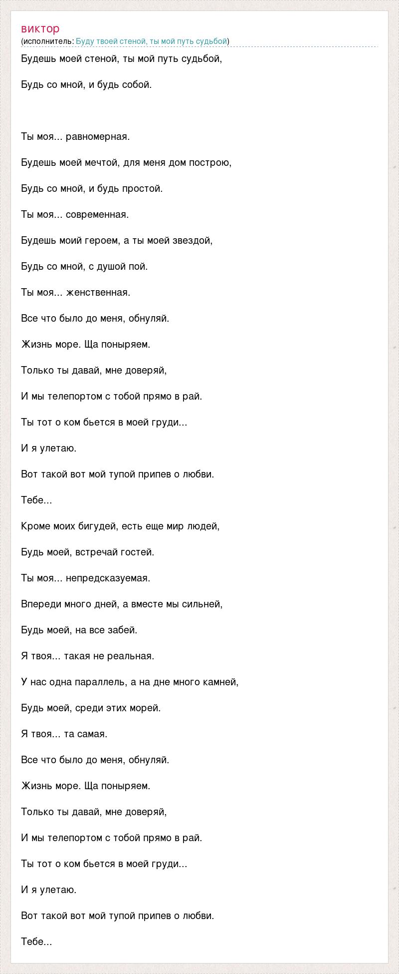 Будешь моей стеной, ты мой путь судьбой, Будь со мной, и будь собой. Ты моя... равномерная. Будешь моей мечтой, для меня дом построю, Будь со мной, и будь простой. Ты моя... современная. Будешь моий героем, а ты моей звездой, Будь со мной, с душой пой. Ты моя... женственная. Все что было до меня, обнуляй. Жизнь море. Ща поныряем. Только ты давай, мне доверяй, И мы телепортом с тобой прямо в рай. Ты тот о ком бьется в моей груди... И я улетаю. Вот такой вот мой тупой припев о любви. Тебе... Кроме моих бигудей, есть еще мир людей, Будь моей, встречай гостей. Ты моя... непредсказуемая. Впереди много дней, а вместе мы сильней, Будь моей, на все забей. Я твоя... такая не реальная. У нас одна параллель, а на дне много камней, Будь моей, среди этих морей. Я твоя... та самая. Все что было до меня, обнуляй. Жизнь море. Ща поныряем. Только ты давай, мне доверяй, И мы телепортом с тобой прямо в рай. Ты тот о ком бьется в моей груди... И я улетаю. Вот такой вот мой тупой припев о любви. Тебе...