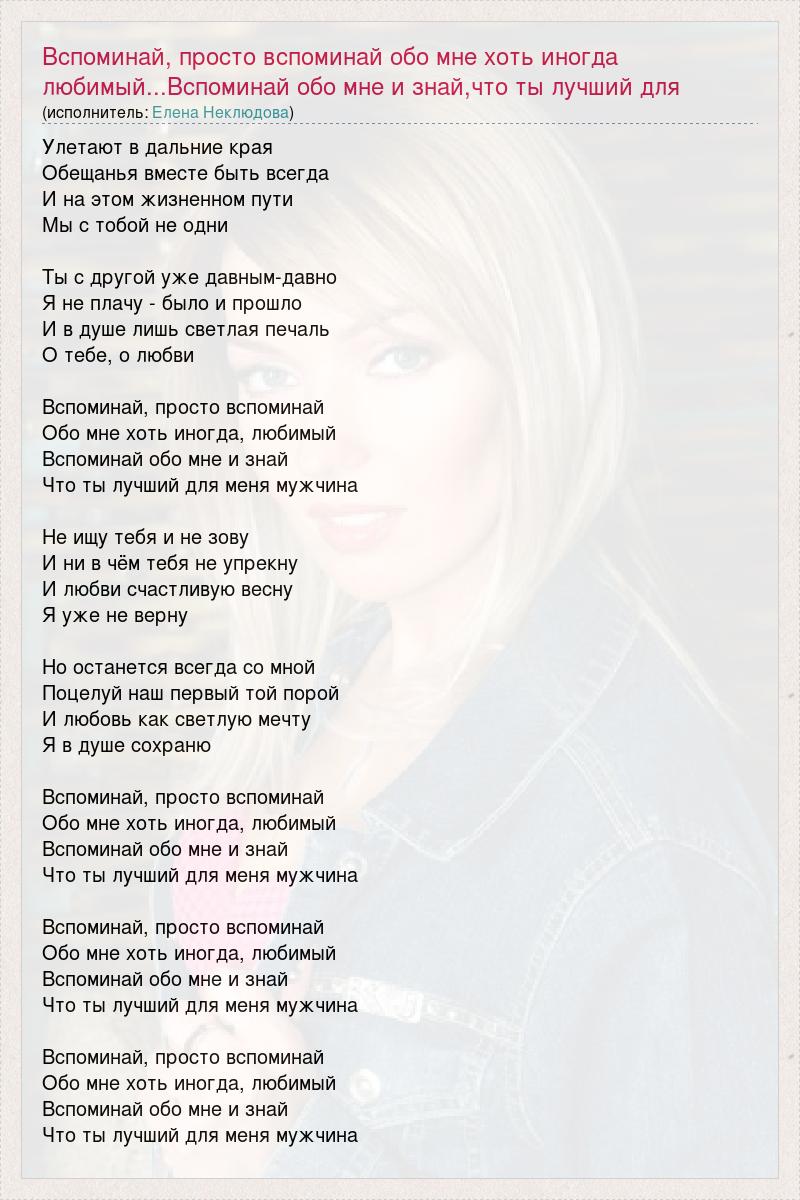 Улетают в дальние края Обещанья вместе быть всегда И на этом жизненном пути Мы с тобой не одни Ты с другой уже давным-давно Я не плачу - было и прошло И в душе лишь светлая печаль О тебе, о любви Вспоминай, просто вспоминай Обо мне хоть иногда, любимый Вспоминай обо мне и знай Что ты лучший для меня мужчина Не ищу тебя и не зову И ни в чём тебя не упрекну И любви счастливую весну Я уже не верну Но останется всегда со мной Поцелуй наш первый той порой И любовь как светлую мечту Я в душе сохраню Вспоминай, просто вспоминай Обо мне хоть иногда, любимый Вспоминай обо мне и знай Что ты лучший для меня мужчина Вспоминай, просто вспоминай Обо мне хоть иногда, любимый Вспоминай обо мне и знай Что ты лучший для меня мужчина Вспоминай, просто вспоминай Обо мне хоть иногда, любимый Вспоминай обо мне и знай Что ты лучший для меня мужчина