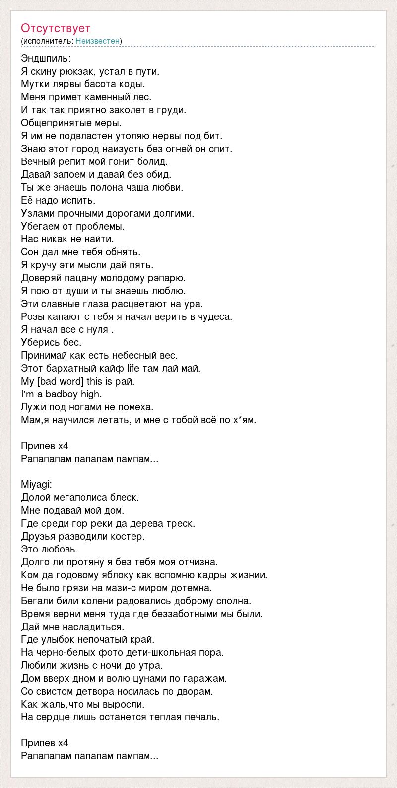 Эндшпиль: Я скину рюкзак, устал в пути. Мутки лярвы басота коды. Меня примет каменный лес. И так так приятно заколет в груди. Общепринятые меры. Я им не подвластен утоляю нервы под бит. Знаю этот город наизусть без огней он спит. Вечный репит мой гонит болид. Давай запоем и давай без обид. Ты же знаешь полона чаша любви. Её надо испить. Узлами прочными дорогами долгими. Убегаем от проблемы. Нас никак не найти. Сон дал мне тебя обнять. Я кручу эти мысли дай пять. Доверяй пацану молодому рэпарю. Я пою от души и ты знаешь люблю. Эти славные глаза расцветают на ура. Розы капают с тебя я начал верить в чудеса. Я начал все с нуля . Уберись бес. Принимай как есть небесный вес. Этот бархатный кайф life там лай май. My [bad word] this is рай. I'm a badboy high. Лужи под ногами не помеха. Мам,я научился летать, и мне с тобой всё по х*ям. Припев x4 Рапапапам папапам пампам... Miyagi: Долой мегаполиса блеск. Мне подавай мой дом. Где среди гор реки да дерева треск. Друзья разводили костер. Это любовь. Долго ли протяну я без тебя моя отчизна. Ком да годовому яблоку как вспомню кадры жизнии. Не было грязи на мази-с миром дотемна. Бегали били колени радовались доброму сполна. Время верни меня туда где беззаботными мы были. Дай мне насладиться. Где улыбок непочатый край. На черно-белых фото дети-школьная пора. Любили жизнь с ночи до утра. Дом вверх дном и волю цунами по гаражам. Со свистом детвора носилась по дворам. Как жаль,что мы выросли. На сердце лишь останется теплая печаль. Припев x4 Рапапапам папапам пампам...