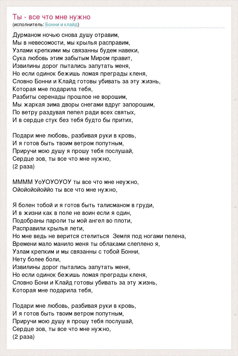 Дурманом ночью снова душу отравим, Мы в невесомости, мы крылья расправим, Узлами крепкими мы связанны будем навеки, Сука любовь этим забытым Миром правит, Извилины дорог пытались запутать меня, Но если одинок бежишь ломая преграды кленя, Словно Бонни и Клайд готовы убивать за эту жизнь, Которая мне подарила тебя, Разбиты серенады прошлое не ворошим, Мы жаркая зима дворы снегами вдруг запорошим, По ветру раздувая пепел ради всех святых, И в сердце стук без тебя будто бы притих, Подари мне любовь, разбивая руки в кровь, И я готов быть твоим ветром попутным, Приручи мою душу я прошу тебя послушай, Сердце зов, ты все что мне нужно, (2 раза) ММММ УоУОУОУОУ ты все что мне неужно, Ойойойойоййо ты все что мне нужно, Я болен тобой и я готов быть талисманом в груди, И в жизни как в поле не воин если я один, Подобраны пароли ты мой ангел во плоти, Расправили крылья лети, Но мне ведь не верится стелиться Земля под ногами пелена, Времени мало манило меня ты облаками слеплено я, Узлам крепким и мы связанны с тобой Бонни, Нету более боли, Извилины дорог пытались запутать меня, Но если одинок бежишь ломая преграды кленя, Словно Бони и Клайд готовы убивать за эту жизнь, Которая мне подарила тебя, Подари мне любовь, разбивая руки в кровь, И я готов быть твоим ветром попутным, Приручи мою душу я прошу тебя послушай, Сердце зов, ты все что мне нужно, (2 раза)