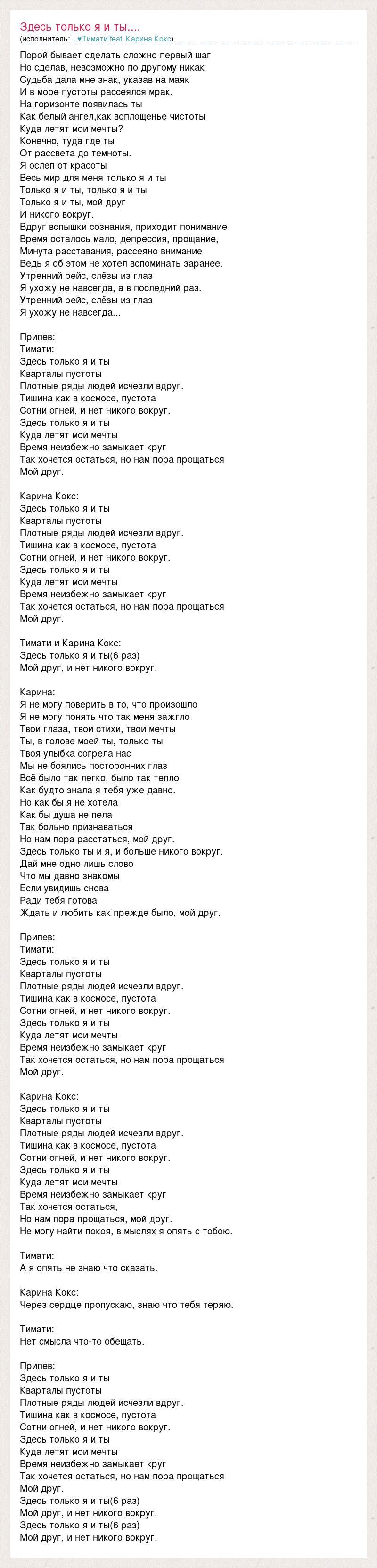 Порой бывает сделать сложно первый шаг Но сделав, невозможно по другому никак Судьба дала мне знак, указав на маяк И в море пустоты рассеялся мрак. На горизонте появилась ты Как белый ангел,как воплощенье чистоты Куда летят мои мечты? Конечно, туда где ты От рассвета до темноты. Я ослеп от красоты Весь мир для меня только я и ты Только я и ты, только я и ты Только я и ты, мой друг И никого вокруг. Вдруг вспышки сознания, приходит понимание Время осталось мало, депрессия, прощание, Минута расставания, рассеяно внимание Ведь я об этом не хотел вспоминать заранее. Утренний рейс, слёзы из глаз Я ухожу не навсегда, а в последний раз. Утренний рейс, слёзы из глаз Я ухожу не навсегда... Припев: Тимати: Здесь только я и ты Кварталы пустоты Плотные ряды людей исчезли вдруг. Тишина как в космосе, пустота Сотни огней, и нет никого вокруг. Здесь только я и ты Куда летят мои мечты Время неизбежно замыкает круг Так хочется остаться, но нам пора прощаться Мой друг. Карина Кокс: Здесь только я и ты Кварталы пустоты Плотные ряды людей исчезли вдруг. Тишина как в космосе, пустота Сотни огней, и нет никого вокруг. Здесь только я и ты Куда летят мои мечты Время неизбежно замыкает круг Так хочется остаться, но нам пора прощаться Мой друг. Тимати и Карина Кокс: Здесь только я и ты(6 раз) Мой друг, и нет никого вокруг. Карина: Я не могу поверить в то, что произошло Я не могу понять что так меня зажгло Твои глаза, твои стихи, твои мечты Ты, в голове моей ты, только ты Твоя улыбка согрела нас Мы не боялись посторонних глаз Всё было так легко, было так тепло Как будто знала я тебя уже давно. Но как бы я не хотела Как бы душа не пела Так больно признаваться Но нам пора расстаться, мой друг. Здесь только ты и я, и больше никого вокруг. Дай мне одно лишь слово Что мы давно знакомы Если увидишь снова Ради тебя готова Ждать и любить как прежде было, мой друг. Припев: Тимати: Здесь только я и ты Кварталы пустоты Плотные ряды людей исчезли вдруг. Тишина как в космосе, пустота Сотни огней, и нет никого вокруг. Здесь только я и ты Куда летят мои мечты Время неизбежно замыкает круг Так хочется остаться, но нам пора прощаться Мой друг. Карина Кокс: Здесь только я и ты Кварталы пустоты Плотные ряды людей исчезли вдруг. Тишина как в космосе, пустота Сотни огней, и нет никого вокруг. Здесь только я и ты Куда летят мои мечты Время неизбежно замыкает круг Так хочется остаться, Но нам пора прощаться, мой друг. Не могу найти покоя, в мыслях я опять с тобою. Тимати: А я опять не знаю что сказать. Карина Кокс: Через сердце пропускаю, знаю что тебя теряю. Тимати: Нет смысла что-то обещать. Припев: Здесь только я и ты Кварталы пустоты Плотные ряды людей исчезли вдруг. Тишина как в космосе, пустота Сотни огней, и нет никого вокруг. Здесь только я и ты Куда летят мои мечты Время неизбежно замыкает круг Так хочется остаться, но нам пора прощаться Мой друг. Здесь только я и ты(6 раз) Мой друг, и нет никого вокруг. Здесь только я и ты(6 раз) Мой друг, и нет никого вокруг.