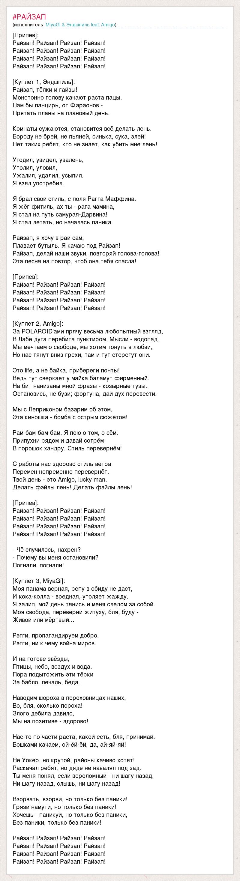 [Припев]: Райзап! Райзап! Райзап! Райзап! Райзап! Райзап! Райзап! Райзап! Райзап! Райзап! Райзап! Райзап! Райзап! Райзап! Райзап! Райзап! [Куплет 1, Эндшпиль]: Райзап, тёлки и гайзы! Монотонно голову качают раста пацы. Нам бы панцирь, от Фараонов - Прятать планы на плановый день. Комнаты сужаются, становится всё делать лень. Бороду не брей, не пьяней, синька, сука, злей! Нет таких ребят, кто не знает, как убить мне лень! Угодил, увидел, увалень, Утолил, уловил, Ужалил, удалил, усыпил. Я взял употребил. Я брал свой стиль, с поля Рагга Маффина. Я жёг фитиль, ах ты - рага мамина, Я стал на путь самурая-Дарвина! Я стал летать, но началась паника. Райзап, я хочу в рай сам, Плавает бутыль. Я качаю под Райзап! Райзап, делай наши звуки, повторяй голова-голова! Эта песня на повтор, чтоб она тебя спасла! [Припев]: Райзап! Райзап! Райзап! Райзап! Райзап! Райзап! Райзап! Райзап! Райзап! Райзап! Райзап! Райзап! Райзап! Райзап! Райзап! Райзап! [Куплет 2, Amigo]: За POLAROID'ами прячу весьма любопытный взгляд, В Лабе дуга перебита пунктиром. Мысли - водопад. Мы мечтаем о свободе, мы хотим тонуть в любви, Но нас тянут вниз грехи, там и тут стерегут они. Это life, а не байка, прибереги понты! Ведь тут сверкает у майка баламут фирменный. На бит нанизаны мной фразы - козырные тузы. Остановись, не бузи; фортуна, дай дух перевести. Мы с Леприконом базарим об этом, Эта киношка - бомба с острым сюжетом! Рам-бам-бам-бам. Я пою о том, о сём. Припухни рядом и давай сотрём В порошок хандру. Стиль перевернём! С работы нас здорово стиль ветра Перемен непременно перевернёт. Твой день - это Amigo, lucky man. Делать фэйлы лень! Делать фэйлы лень! [Припев]: Райзап! Райзап! Райзап! Райзап! Райзап! Райзап! Райзап! Райзап! Райзап! Райзап! Райзап! Райзап! Райзап! Райзап! Райзап! Райзап! - Чё случилось, нахрен? - Почему вы меня остановили? Погнали, погнали! [Куплет 3, MiyaGi]: Моя панама верная, репу в обиду не даст, И кока-колла - вредная, утоляет жажду. Я залип, мой день тянись и меня следом за собой. Моя свобода, переверни житуху, бля, буду - Живой или мёртвый... Рэгги, пропагандируем добро. Рэгги, ни к чему война миров. И на готове звёзды, Птицы, небо, воздух и вода. Пора подытожить эти тёрки За бабло, печаль, беда. Наводим шороха в пороховницах наших, Во, бля, сколько пороха! Злого дебила давило, Мы на позитиве - здорово! Нас-то по части раста, какой есть, бля, принимай. Бошками качаем, ой-ёй-ёй, да, ай-яй-яй! Не Уокер, но крутой, районы качиво хотят! Раскачал ребят, но дяде не навалял под зад. Ты меня понял, если вероломный - ни шагу назад, Ни шагу назад, слышь, ни шагу назад! Взорвать, взорви, но только без паники! Грязи намути, но только без паники! Хочешь - паникуй, но только без паники, Без паники, только без паники! Райзап! Райзап! Райзап! Райзап! Райзап! Райзап! Райзап! Райзап! Райзап! Райзап! Райзап! Райзап! Райзап! Райзап! Райзап! Райзап!