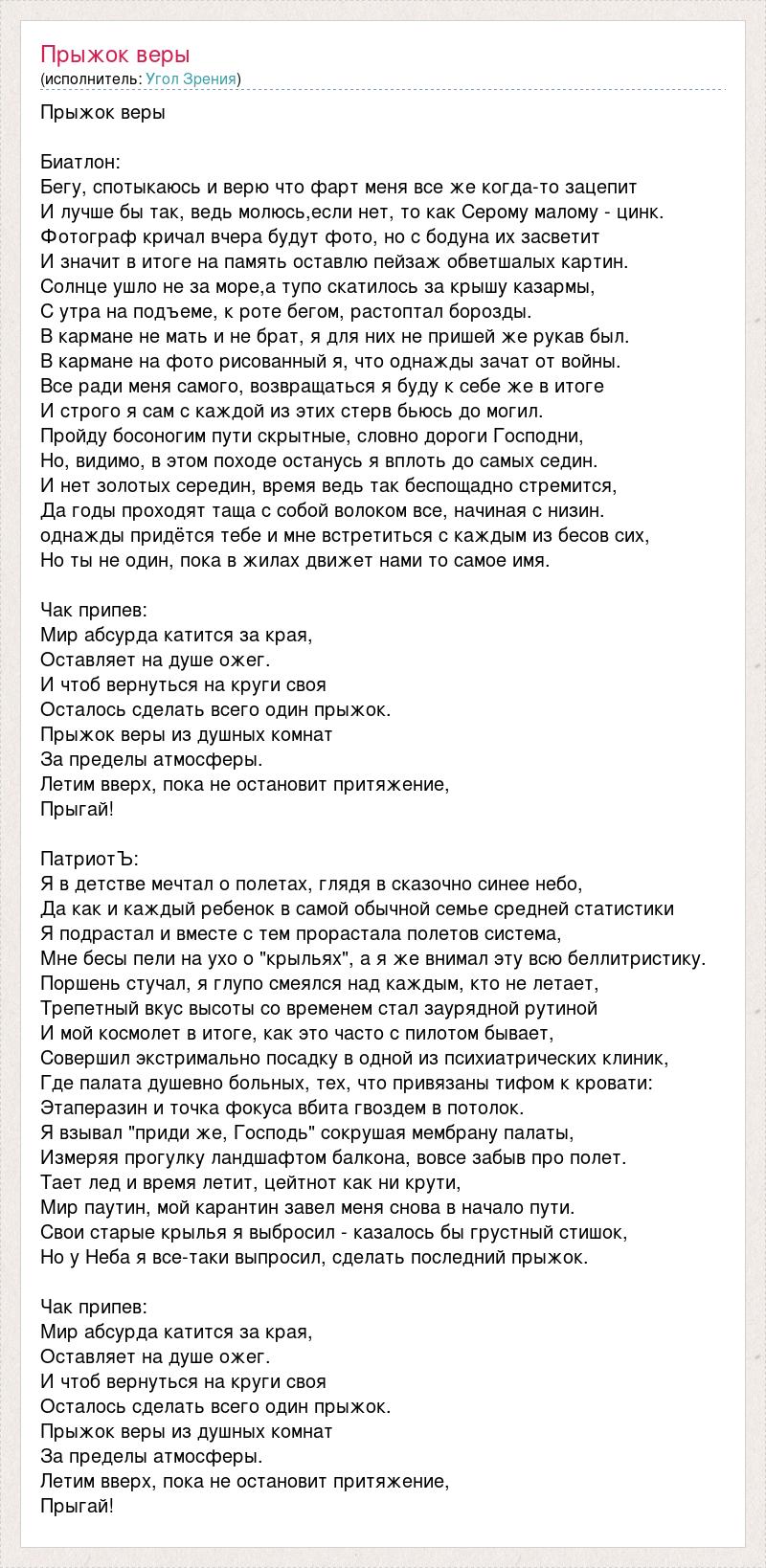 Прыжок веры Биатлон: Бегу, спотыкаюсь и верю что фарт меня все же когда-то зацепит И лучше бы так, ведь молюсь,если нет, то как Серому малому - цинк. Фотограф кричал вчера будут фото, но с бодуна их засветит И значит в итоге на память оставлю пейзаж обветшалых картин. Солнце ушло не за море,а тупо скатилось за крышу казармы, С утра на подъеме, к роте бегом, растоптал борозды. В кармане не мать и не брат, я для них не пришей же рукав был. В кармане на фото рисованный я, что однажды зачат от войны. Все ради меня самого, возвращаться я буду к себе же в итоге И строго я сам с каждой из этих стерв бьюсь до могил. Пройду босоногим пути скрытные, словно дороги Господни, Но, видимо, в этом походе останусь я вплоть до самых седин. И нет золотых середин, время ведь так беспощадно стремится, Да годы проходят таща с собой волоком все, начиная с низин. однажды придётся тебе и мне встретиться с каждым из бесов сих, Но ты не один, пока в жилах движет нами то самое имя. Чак припев: Мир абсурда катится за края, Оставляет на душе ожег. И чтоб вернуться на круги своя Осталось сделать всего один прыжок. Прыжок веры из душных комнат За пределы атмосферы. Летим вверх, пока не остановит притяжение, Прыгай! ПатриотЪ: Я в детстве мечтал о полетах, глядя в сказочно синее небо, Да как и каждый ребенок в самой обычной семье средней статистики Я подрастал и вместе с тем прорастала полетов система, Мне бесы пели на ухо о "крыльях", а я же внимал эту всю беллитристику. Поршень стучал, я глупо смеялся над каждым, кто не летает, Трепетный вкус высоты со временем стал заурядной рутиной И мой космолет в итоге, как это часто с пилотом бывает, Совершил экстримально посадку в одной из психиатрических клиник, Где палата душевно больных, тех, что привязаны тифом к кровати: Этаперазин и точка фокуса вбита гвоздем в потолок. Я взывал "приди же, Господь" сокрушая мембрану палаты, Измеряя прогулку ландшафтом балкона, вовсе забыв про полет. Тает лед и время летит, цейтнот как ни крути, Мир паутин, мой карантин завел меня снова в начало пути. Свои старые крылья я выбросил - казалось бы грустный стишок, Но у Неба я все-таки выпросил, сделать последний прыжок. Чак припев: Мир абсурда катится за края, Оставляет на душе ожег. И чтоб вернуться на круги своя Осталось сделать всего один прыжок. Прыжок веры из душных комнат За пределы атмосферы. Летим вверх, пока не остановит притяжение, Прыгай!