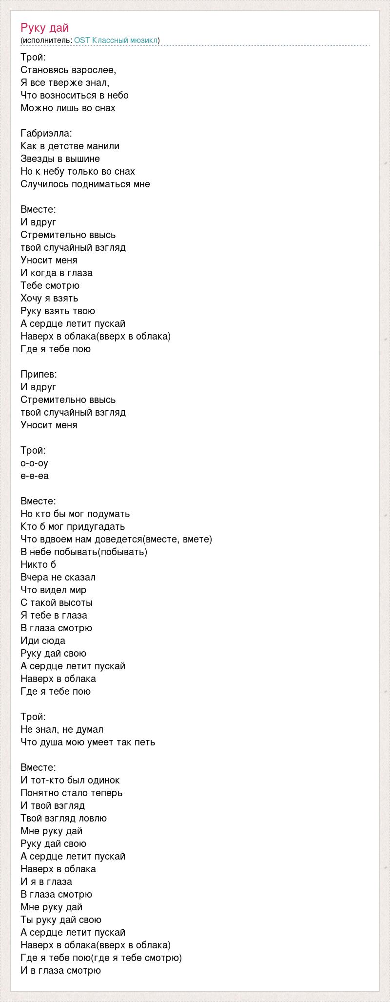 Трой: Становясь взрослее, Я все тверже знал, Что возноситься в небо Можно лишь во снах Габриэлла: Как в детстве манили Звезды в вышине Но к небу только во снах Случилось подниматься мне Вместе: И вдруг Стремительно ввысь твой случайный взгляд Уносит меня И когда в глаза Тебе смотрю Хочу я взять Руку взять твою А сердце летит пускай Наверх в облака(вверх в облака) Где я тебе пою Припев: И вдруг Стремительно ввысь твой случайный взгляд Уносит меня Трой: о-о-оу е-е-еа Вместе: Но кто бы мог подумать Кто б мог придугадать Что вдвоем нам доведется(вместе, вмете) В небе побывать(побывать) Никто б Вчера не сказал Что видел мир С такой высоты Я тебе в глаза В глаза смотрю Иди сюда Руку дай свою А сердце летит пускай Наверх в облака Где я тебе пою Трой: Не знал, не думал Что душа мою умеет так петь Вместе: И тот-кто был одинок Понятно стало теперь И твой взгляд Твой взгляд ловлю Мне руку дай Руку дай свою А сердце летит пускай Наверх в облака И я в глаза В глаза смотрю Мне руку дай Ты руку дай свою А сердце летит пускай Наверх в облака(вверх в облака) Где я тебе пою(где я тебе смотрю) И в глаза смотрю