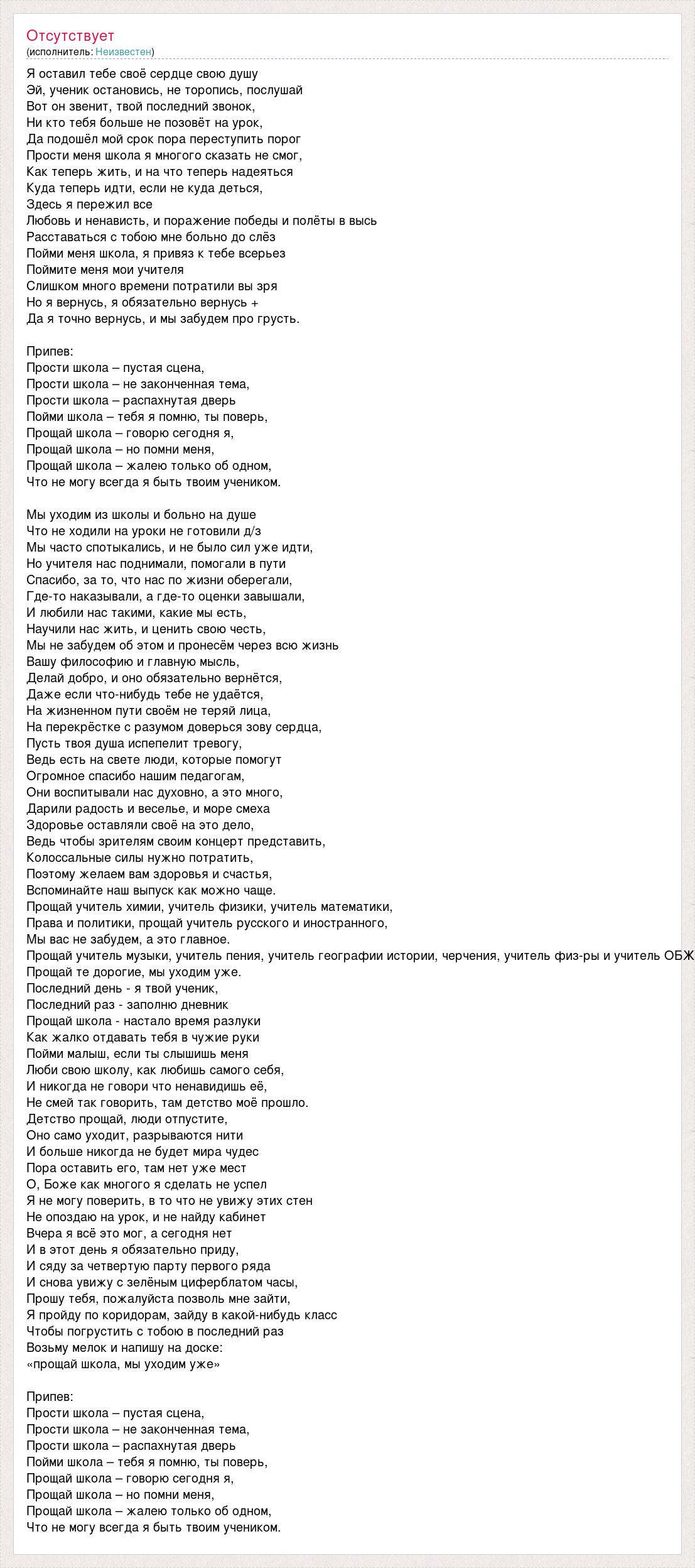 Я оставил тебе своё сердце свою душу Эй, ученик остановись, не торопись, послушай Вот он звенит, твой последний звонок, Ни кто тебя больше не позовёт на урок, Да подошёл мой срок пора переступить порог Прости меня школа я многого сказать не смог, Как теперь жить, и на что теперь надеяться Куда теперь идти, если не куда деться, Здесь я пережил все Любовь и ненависть, и поражение победы и полёты в высь Расставаться с тобою мне больно до слёз Пойми меня школа, я привяз к тебе всерьез Поймите меня мои учителя Слишком много времени потратили вы зря Но я вернусь, я обязательно вернусь + Да я точно вернусь, и мы забудем про грусть. Припев: Прости школа – пустая сцена, Прости школа – не законченная тема, Прости школа – распахнутая дверь Пойми школа – тебя я помню, ты поверь, Прощай школа – говорю сегодня я, Прощай школа – но помни меня, Прощай школа – жалею только об одном, Что не могу всегда я быть твоим учеником. Мы уходим из школы и больно на душе Что не ходили на уроки не готовили д/з Мы часто спотыкались, и не было сил уже идти, Но учителя нас поднимали, помогали в пути Спасибо, за то, что нас по жизни оберегали, Где-то наказывали, а где-то оценки завышали, И любили нас такими, какие мы есть, Научили нас жить, и ценить свою честь, Мы не забудем об этом и пронесём через всю жизнь Вашу философию и главную мысль, Делай добро, и оно обязательно вернётся, Даже если что-нибудь тебе не удаётся, На жизненном пути своём не теряй лица, На перекрёстке с разумом доверься зову сердца, Пусть твоя душа испепелит тревогу, Ведь есть на свете люди, которые помогут Огромное спасибо нашим педагогам, Они воспитывали нас духовно, а это много, Дарили радость и веселье, и море смеха Здоровье оставляли своё на это дело, Ведь чтобы зрителям своим концерт представить, Колоссальные силы нужно потратить, Поэтому желаем вам здоровья и счастья, Вспоминайте наш выпуск как можно чаще. Прощай учитель химии, учитель физики, учитель математики, Права и политики, прощай учитель русского и иностранного, Мы вас не забудем, а это главное. Прощай учитель музыки, учитель пения, учитель географии истории, черчения, учитель физ-ры и учитель ОБЖ Прощай те дорогие, мы уходим уже. Последний день - я твой ученик, Последний раз - заполню дневник Прощай школа - настало время разлуки Как жалко отдавать тебя в чужие руки Пойми малыш, если ты слышишь меня Люби свою школу, как любишь самого себя, И никогда не говори что ненавидишь её, Не смей так говорить, там детство моё прошло. Детство прощай, люди отпустите, Оно само уходит, разрываются нити И больше никогда не будет мира чудес Пора оставить его, там нет уже мест О, Боже как многого я сделать не успел Я не могу поверить, в то что не увижу этих стен Не опоздаю на урок, и не найду кабинет Вчера я всё это мог, а сегодня нет И в этот день я обязательно приду, И сяду за четвертую парту первого ряда И снова увижу с зелёным циферблатом часы, Прошу тебя, пожалуйста позволь мне зайти, Я пройду по коридорам, зайду в какой-нибудь класс Чтобы погрустить с тобою в последний раз Возьму мелок и напишу на доске: «прощай школа, мы уходим уже» Припев: Прости школа – пустая сцена, Прости школа – не законченная тема, Прости школа – распахнутая дверь Пойми школа – тебя я помню, ты поверь, Прощай школа – говорю сегодня я, Прощай школа – но помни меня, Прощай школа – жалею только об одном, Что не м