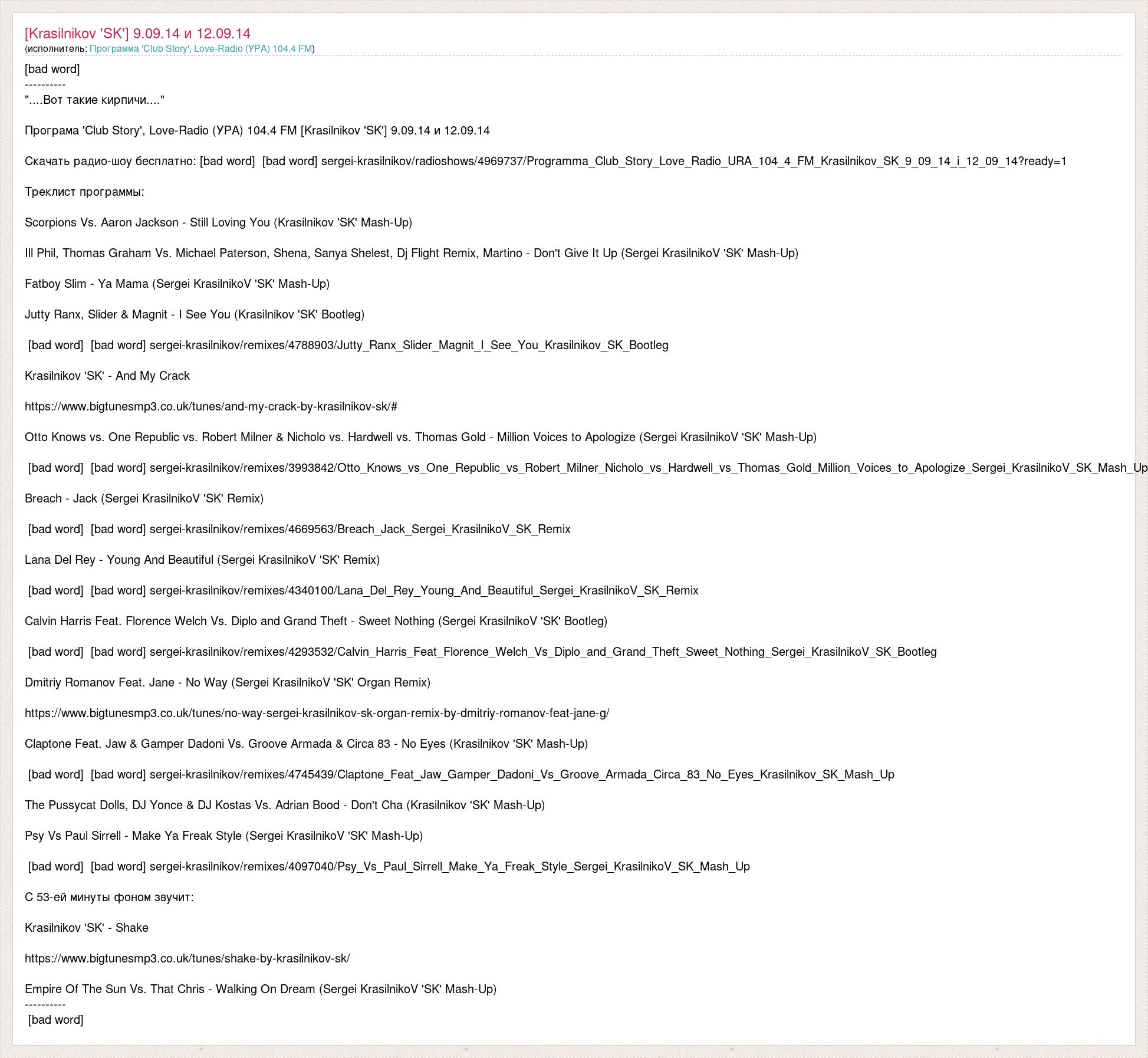 [bad word] ---------- "....Вот такие кирпичи...." Програма 'Club Story', Love-Radio (УРА) 104.4 FM [Krasilnikov 'SK'] 9.09.14 и 12.09.14 Скачать радио-шоу бесплатно: [bad word] [bad word] sergei-krasilnikov/radioshows/4969737/Programma_Club_Story_Love_Radio_URA_104_4_FM_Krasilnikov_SK_9_09_14_i_12_09_14?ready=1 Треклист программы: Scorpions Vs. Aaron Jackson - Still Loving You (Krasilnikov 'SK' Mash-Up) Ill Phil, Thomas Graham Vs. Michael Paterson, Shena, Sanya Shelest, Dj Flight Remix, Martino - Don't Give It Up (Sergei KrasilnikoV 'SK' Mash-Up) Fatboy Slim - Ya Mama (Sergei KrasilnikoV 'SK' Mash-Up) Jutty Ranx, Slider & Magnit - I See You (Krasilnikov 'SK' Bootleg) [bad word] [bad word] sergei-krasilnikov/remixes/4788903/Jutty_Ranx_Slider_Magnit_I_See_You_Krasilnikov_SK_Bootleg Krasilnikov 'SK' - And My Crack https://www.bigtunesmp3.co.uk/tunes/and-my-crack-by-krasilnikov-sk/# Otto Knows vs. One Republic vs. Robert Milner & Nicholo vs. Hardwell vs. Thomas Gold - Million Voices to Apologize (Sergei KrasilnikoV 'SK' Mash-Up) [bad word] [bad word] sergei-krasilnikov/remixes/3993842/Otto_Knows_vs_One_Republic_vs_Robert_Milner_Nicholo_vs_Hardwell_vs_Thomas_Gold_Million_Voices_to_Apologize_Sergei_KrasilnikoV_SK_Mash_Up Breach - Jack (Sergei KrasilnikoV 'SK' Remix) [bad word] [bad word] sergei-krasilnikov/remixes/4669563/Breach_Jack_Sergei_KrasilnikoV_SK_Remix Lana Del Rey - Young And Beautiful (Sergei KrasilnikoV 'SK' Remix) [bad word] [bad word] sergei-krasilnikov/remixes/4340100/Lana_Del_Rey_Young_And_Beautiful_Sergei_KrasilnikoV_SK_Remix Calvin Harris Feat. Florence Welch Vs. Diplo and Grand Theft - Sweet Nothing (Sergei KrasilnikoV 'SK' Bootleg) [bad word] [bad word] sergei-krasilnikov/remixes/4293532/Calvin_Harris_Feat_Florence_Welch_Vs_Diplo_and_Grand_Theft_Sweet_Nothing_Sergei_KrasilnikoV_SK_Bootleg Dmitriy Romanov Feat. Jane - No Way (Sergei KrasilnikoV 'SK' Organ Remix) https://www.bigtunesmp3.co.uk/tunes/no-way-sergei-krasilnikov-sk-organ-remix-by-dmitriy-romanov-feat-jane-g/ Claptone Feat. Jaw & Gamper Dadoni Vs. Groove Armada & Circa 83 - No Eyes (Krasilnikov 'SK' Mash-Up) [bad word] [bad word] sergei-krasilnikov/remixes/4745439/Claptone_Feat_Jaw_Gamper_Dadoni_Vs_Groove_Armada_Circa_83_No_Eyes_Krasilnikov_SK_Mash_Up The Pussycat Dolls, DJ Yonce & DJ Kostas Vs. Adrian Bood - Don't Cha (Krasilnikov 'SK' Mash-Up) Psy Vs Paul Sirrell - Make Ya Freak Style (Sergei KrasilnikoV 'SK' Mash-Up) [bad word] [bad word] sergei-krasilnikov/remixes/4097040/Psy_Vs_Paul_Sirrell_Make_Ya_Freak_Style_Sergei_KrasilnikoV_SK_Mash_Up С 53-ей минуты фоном звучит: Krasilnikov 'SK' - Shake https://www.bigtunesmp3.co.uk/tunes/shake-by-krasilnikov-sk/ Empire Of The Sun Vs. That Chris - Walking On Dream (Sergei KrasilnikoV 'SK' Mash-Up) ---------- [bad word]