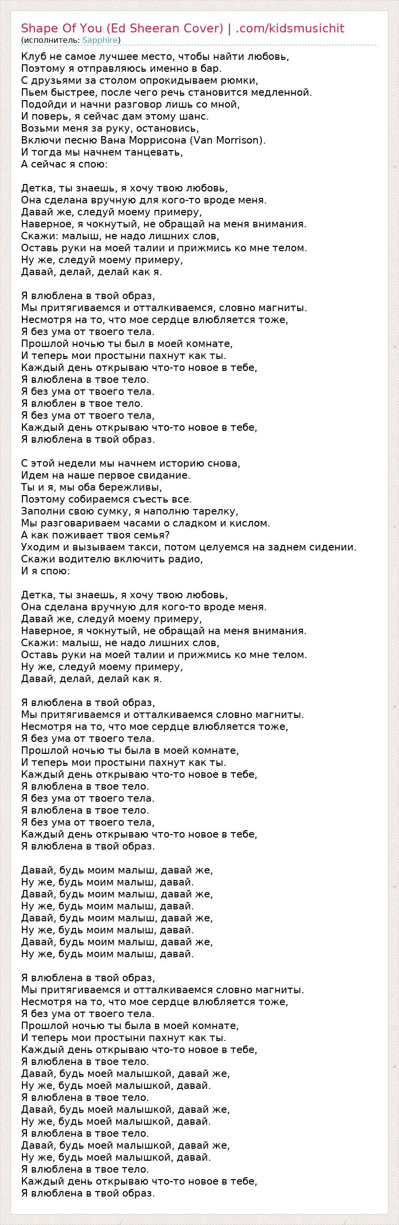 А как ты думаешь, о чем песня "Shape Of You (Ed Sheeran Cover) | .com/kidsmusichit" ?